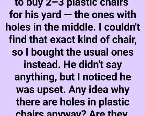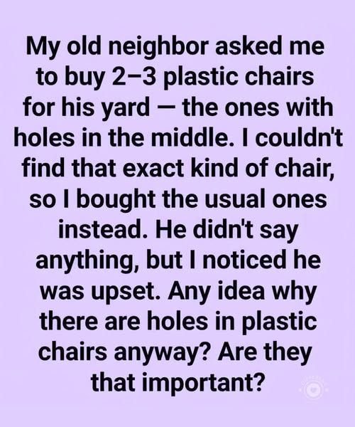 My old neighbor asked me to buy 2-3 plastic chairs for his yard—the ones with holes in the middle.I couldn’t find that exact kind of chair, so I bought the usual ones instead.