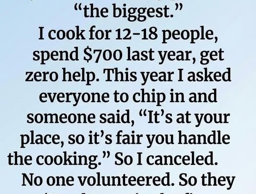 This time, I decided to speak up. I suggested that everyone contribute somehow—bring a dish, chip in for groceries, lend a hand in the kitchen. The room went awkwardly quiet. A few polite nods, a half-hearted joke. Then someone said, almost dismissively, “Well, since it’s at your house, it makes sense that you handle the cooking.”