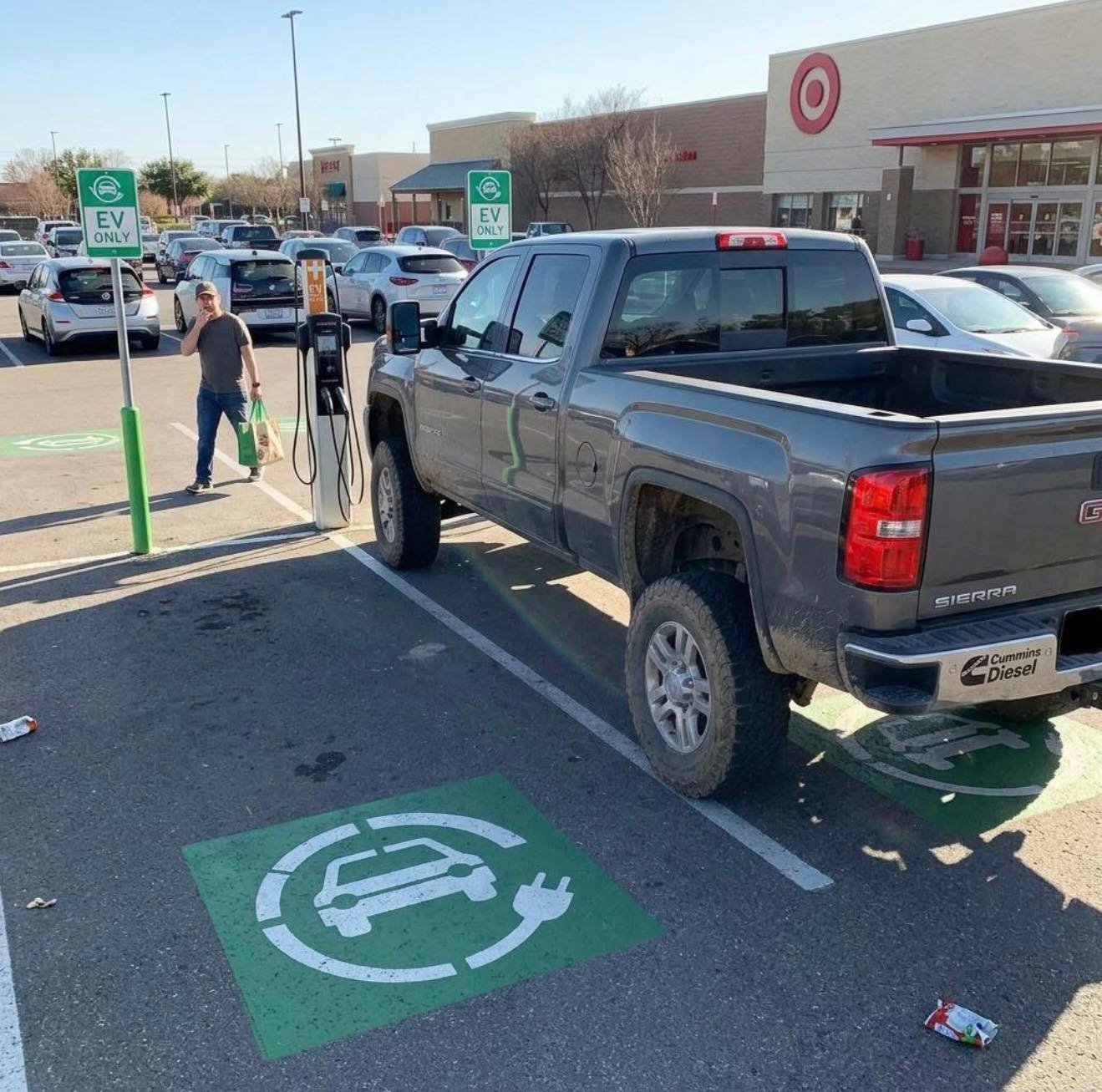 I pulled into Target just trying to run in for five minutes, and of course the parking lot is packed. The only spots near the entrance were the electric vehicle charging spots sitting completely empty, so I figured if no one’s using them, what’s the big deal for a quick stop?