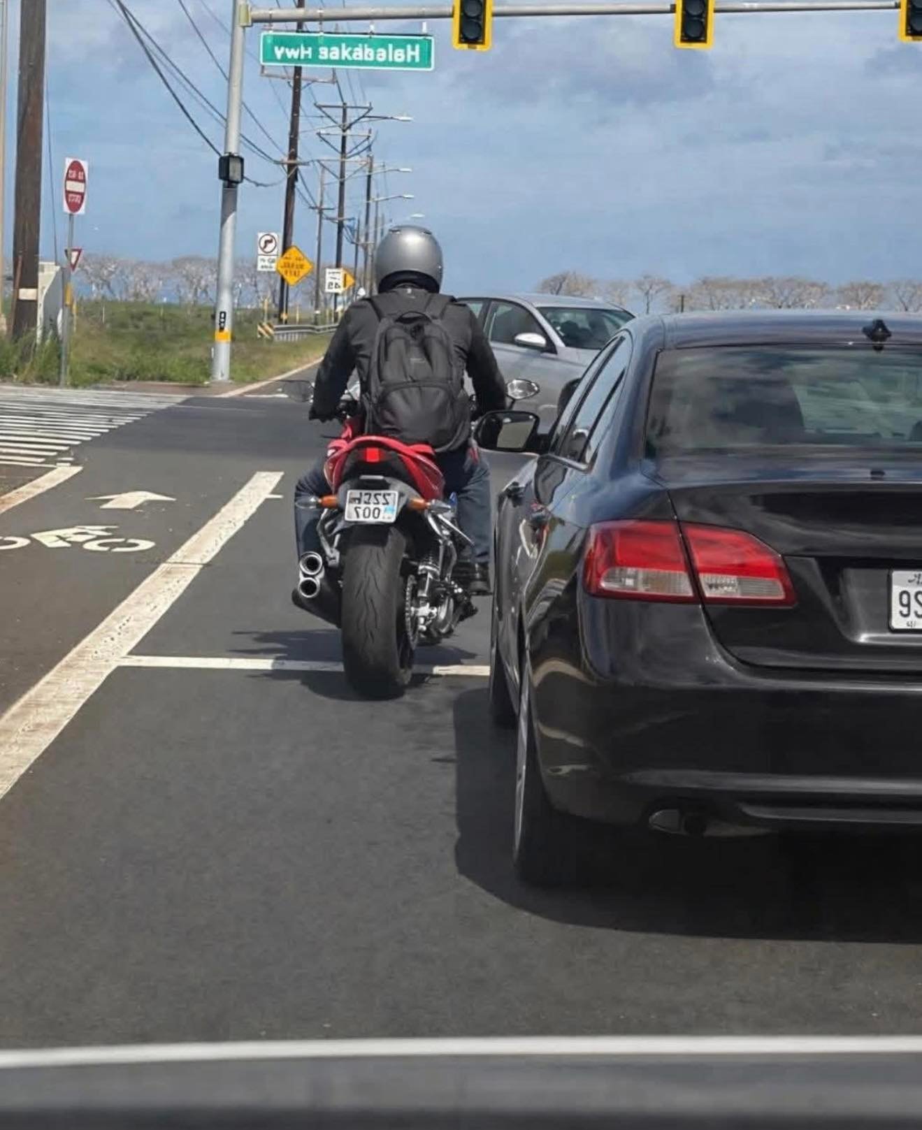 Today’s “asshole of the day” goes to the guy on the motorcycle riding in front of that black car. He sped up and passed everyone on the shoulder just to cut ahead of the entire line.