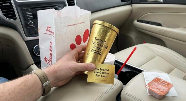 Apparently it’s their “Golden Fan Cup” promotion, so instead of a regular drink cup they slide this metallic looking tumbler across the counter with a little card saying I “scored” it. Everyone behind the counter is smiling like they just handed me something valuable, and I’m just standing there holding a gold plastic cup with a slogan on it.
