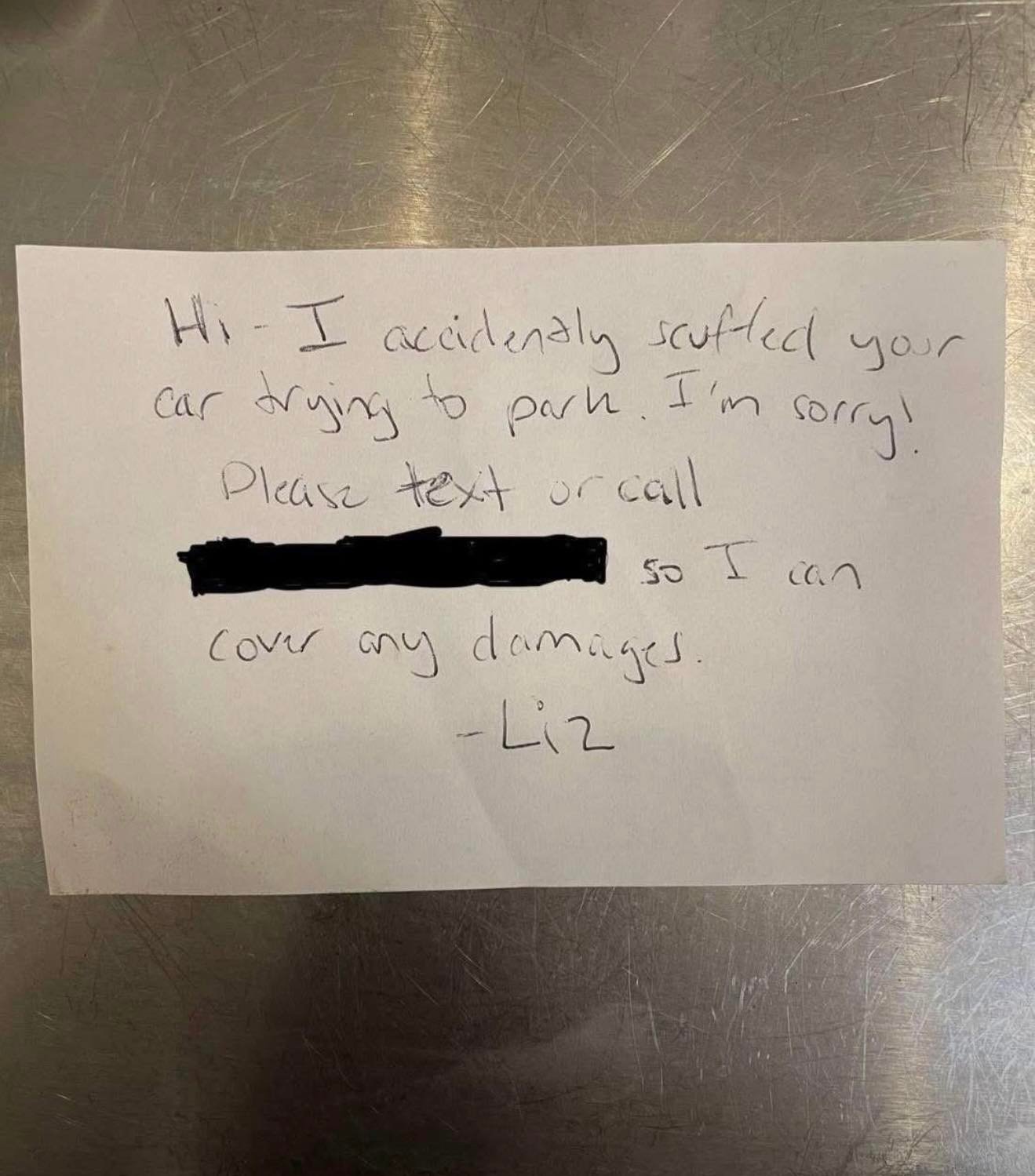 I came back to my car and found damage with zero actual conversation, no waiting around, no accountability. Just a note saying “sorry, I scuffed your car” with a phone number, and I’m supposed to feel like that’s enough.