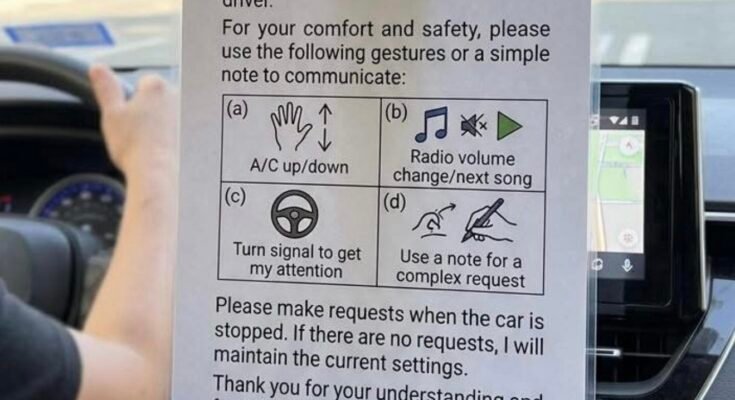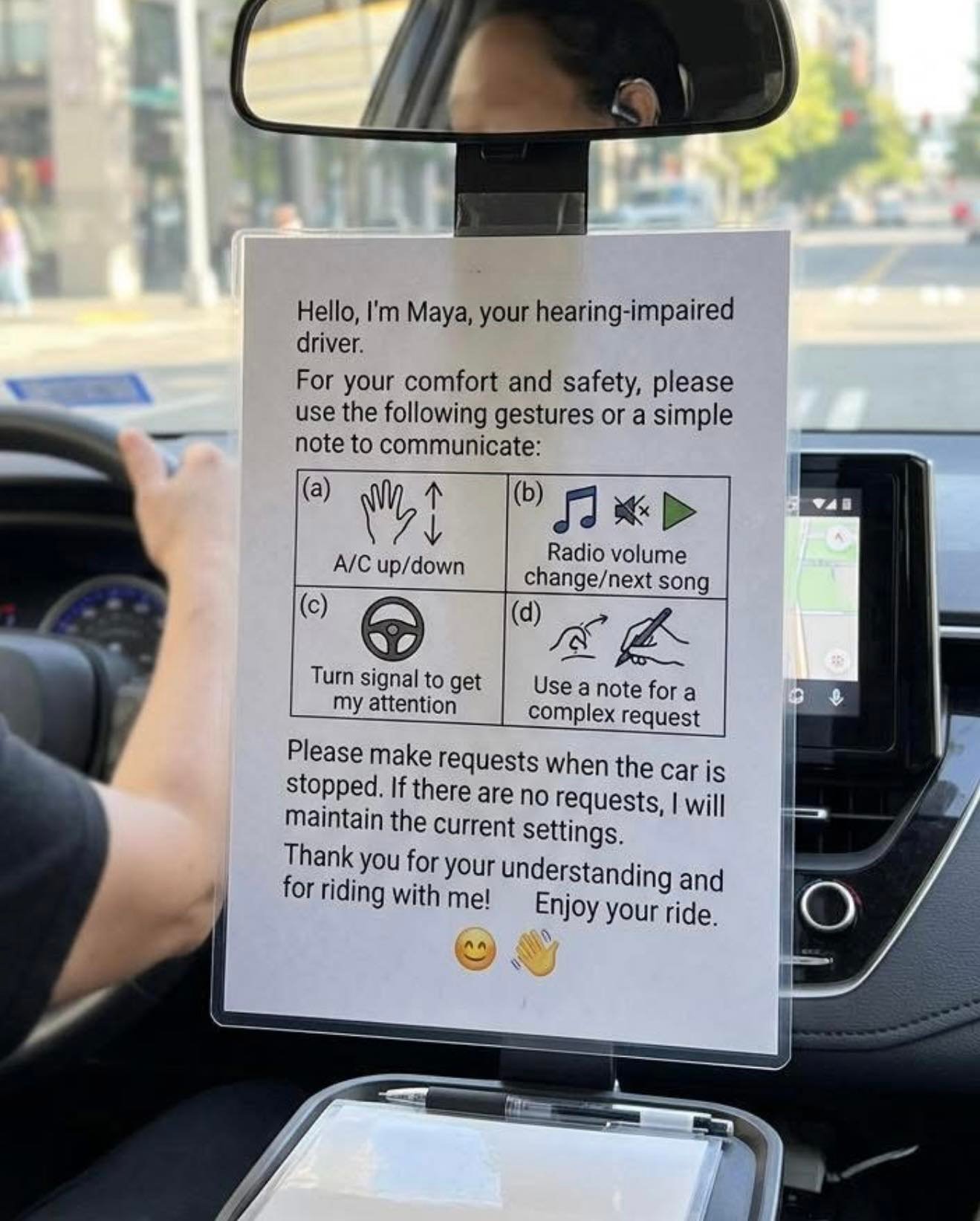 I got into the ride and immediately noticed a large sign explaining that the driver is hearing impaired and that passengers should communicate using hand gestures. It was asking riders to follow a basic system of signals for things like adjusting the air conditioning.
