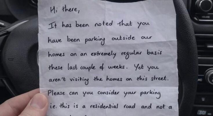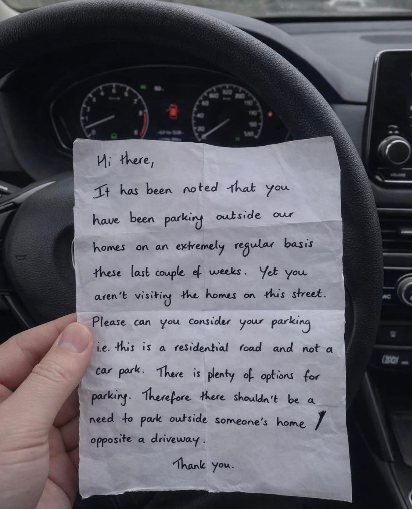 I came back to my son’s car and found a full handwritten essay tucked under the wiper like we’re being investigated over… parking. On a public road. Completely legally. Apparently it’s a “residential road, not a car park,” which is funny because roads are literally meant for cars.