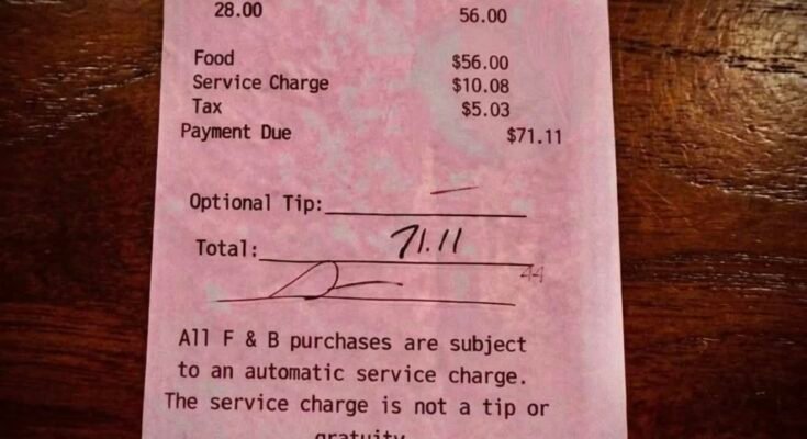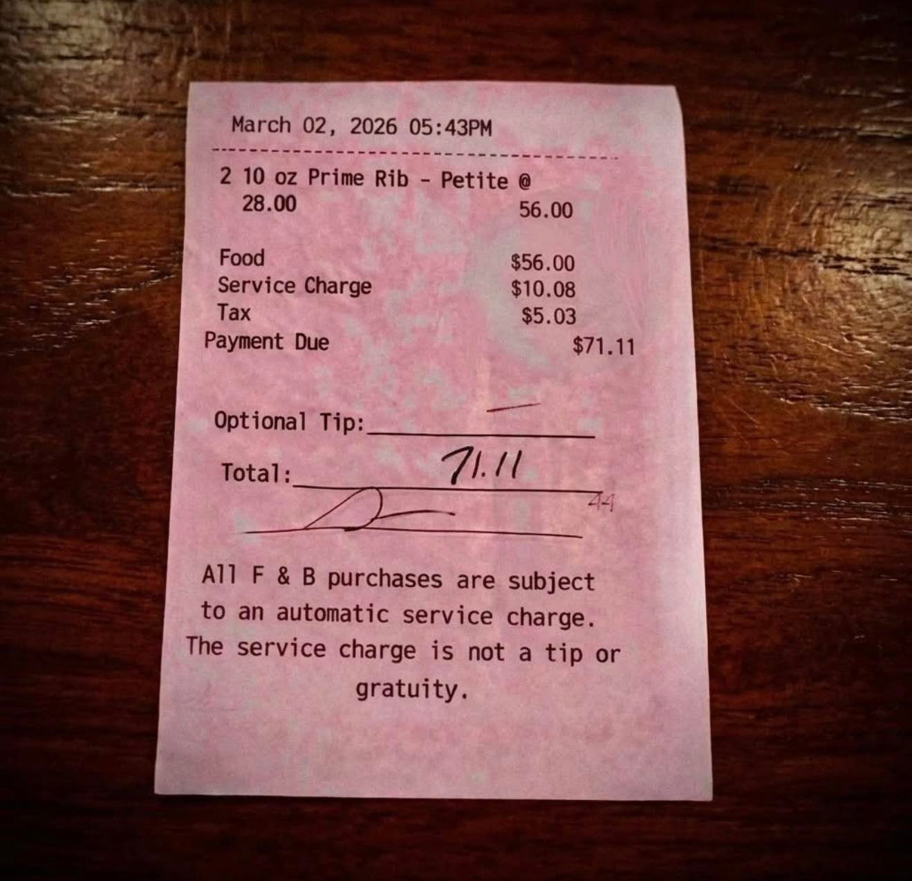 I’ve been serving for eight years. Last night I had a table of two. Prime rib, drinks, the works. Their bill was $71.11. They paid the automatic service charge of $10.08 and left the tip line blank.
