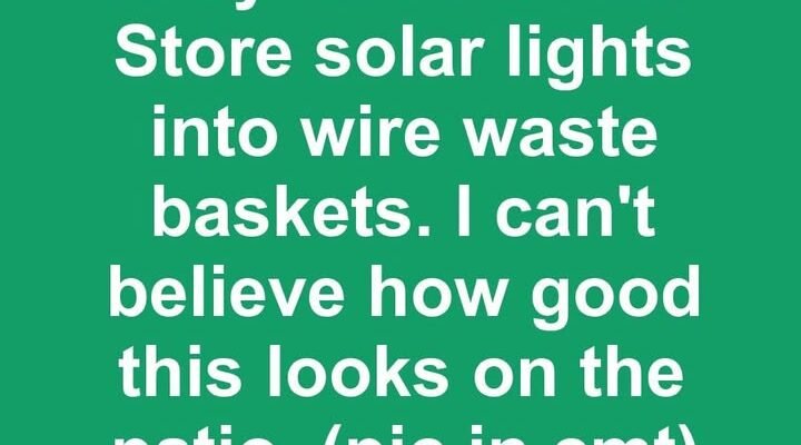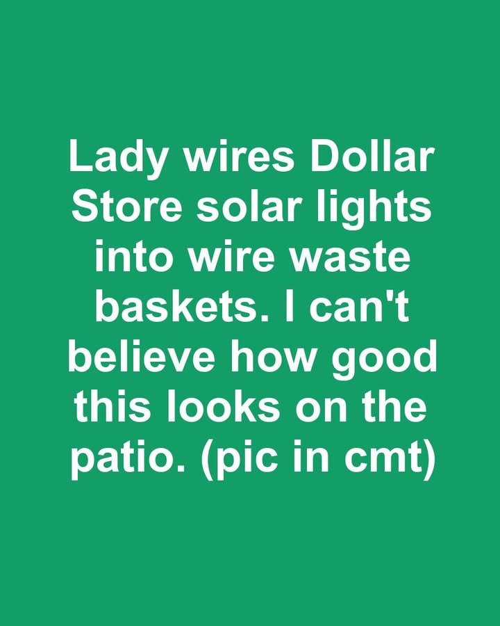 Lady wires Dollar Store solar lights into wire waste baskets. I can’t believe how good this looks on the patio.