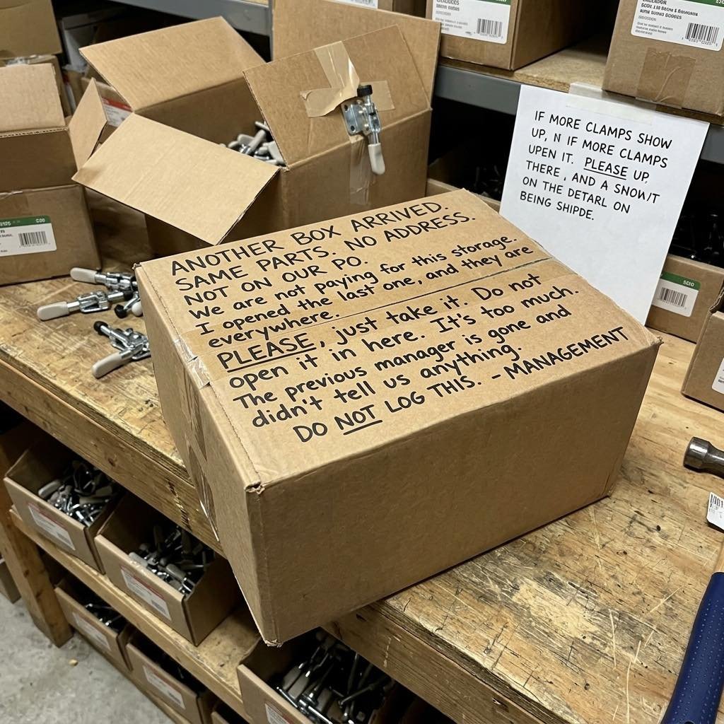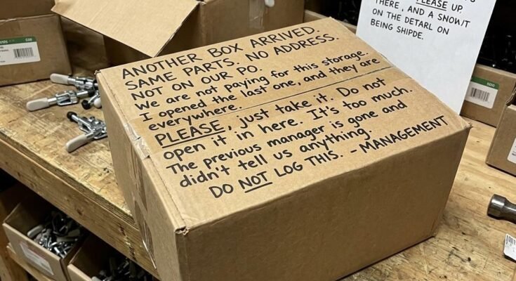 Management at my job decided it was completely fine to have random mystery boxes show up with parts we don’t even use, and instead of fixing it, they taped a note on it basically telling us to ignore it and not log anything. They straight up admitted they’re paying for storage and don’t know where the stuff is coming from, but still told us to just “take it” and keep quiet.