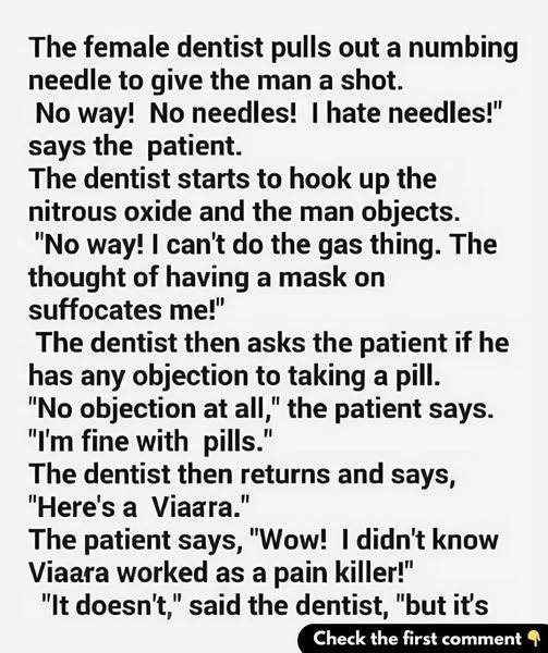 Without missing a beat, the dentist delivered the punchline of the century: “It doesn’t, but it’s going to give you something to hold on to when I pull your tooth!”