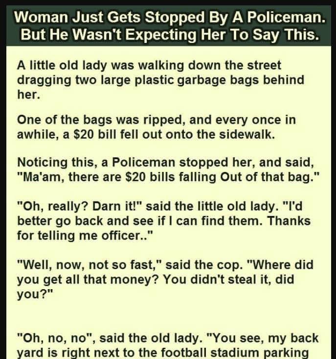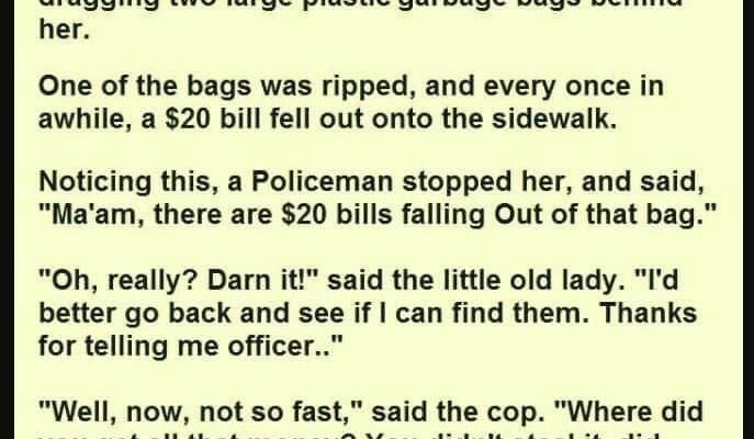 A little old lady was walking down the street dragging two large plastic garbage bags behind her. One of the bags was ripped, and every once in awhile, a $20 bill fell out onto the sidewalk. Noticing this, a Policeman stopped her, and said, “Ma’am, there are $20 bills falling Out of that bag. “Oh, really? Darn it!” said the little old lady. “I’d better go back and see if I can find them. Thanks for telling me officer..” “Well, now, not so fast,” said the cop. “Where did you get all that money?