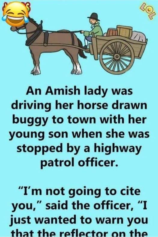 “I’m not going to cite you,” said the officer, “I just wanted to warn you that the reflector on the back of your buggy is broken and it could be dangerous.” “I thank thee,” said the Amish lady, “I shall have my husband repair it as soon as we return home.”