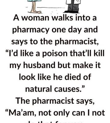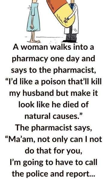 A woman walks into a pharmacy one afternoon, looking calm but determined. She approaches the counter and says to the pharmacist in a low, serious voice, “I need a poison. Something strong, fast-acting… and untraceable. It has to look like my husband died of natural causes.” The pharmacist blinks in shock, then quickly leans forward, whispering back,