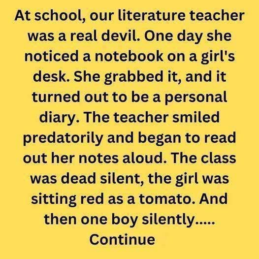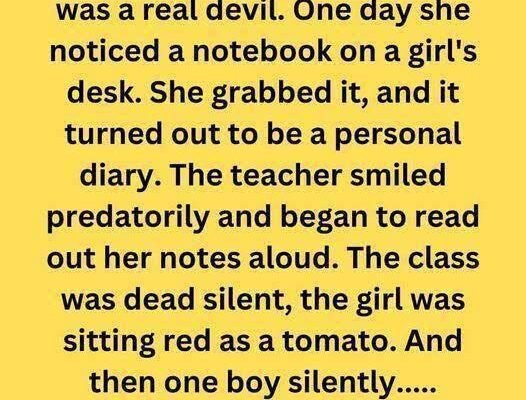 At school, our literature teacher was a real devil — strict, cold, and always looking for ways to assert her power. One day during class, she noticed a small notebook on a girl’s desk. Without a word, she marched over, snatched it up, and flipped through the pages. It wasn’t a notebook at all. It was her personal diary. A cruel smile spread across the teacher’s face. “Let’s see what’s so important it couldn’t wait,