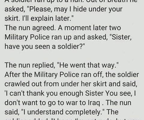The nun replied, “He went that way.”After the Military Police ran off, the soldier crawled out from under her skirt and said, “I can’t thank you enough, Sister. You see, I don’t want to go to war in Iraq.”