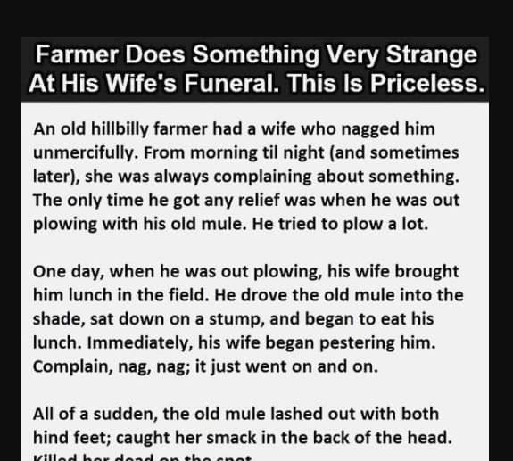 The only time he got any relief was when he was out plowing with his old mule. He tried to plow a lot. One day, when he was out plowing, his wife brought him lunch in the field. He drove the old mule into the shade, sat down on a stump, and began to eat his lunch.Immediately, his wife began pestering him. Complain, nag, nag; it just went on and on. All of a sudden, the old mule lashed out with both hind feet; caught her smack in the back of the head.
