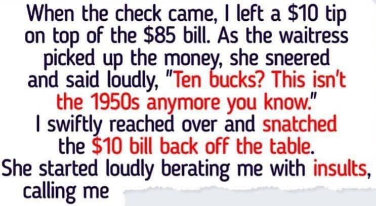 When the check arrived, Amelia left a $10 tip on an $85 bill. The waitress picked up the money and sneered, “Ten bucks? This isn’t the 1950s anymore, you know.” Amelia was stunned by her condescending tone. “I think 10 bucks on an $85 bill is more than fair,” she responded.