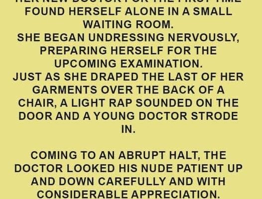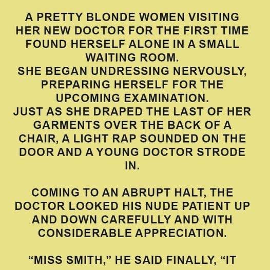 A pretty young blonde visiting her new doctor for the first time found herself alone in a small waiting room.