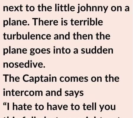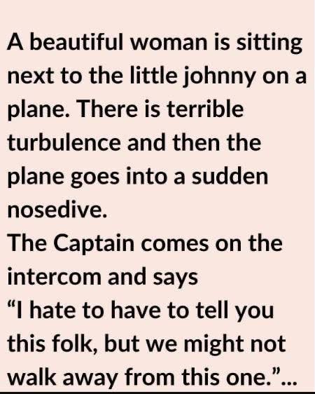 A beautiful woman is sitting next to the little johnny on a plane. There is terrible turbulence and then the plane goes into a sudden nosedive.
