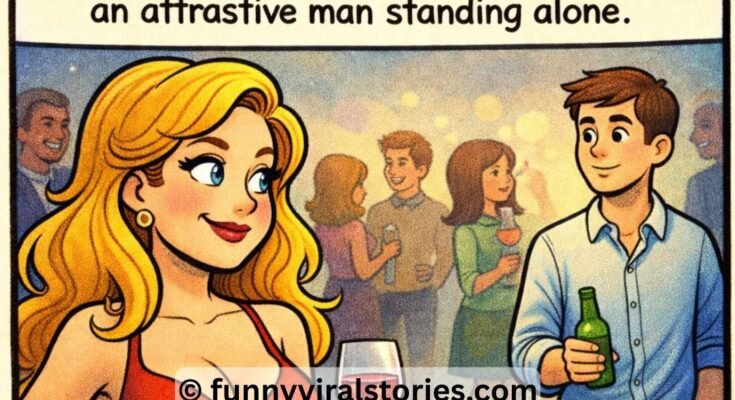 A super hot woman arrived at a party. While scanning the guests, she spotted an attractive man standing alone.
