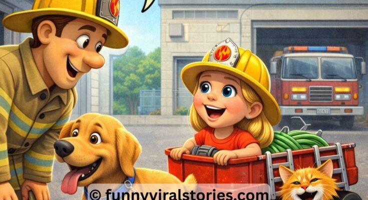 A fireman was working on the engine outside the station, when he noticed a little girl nearby in a little red wagon with little ladders hung off the sides and a garden hose tightly coiled in the middle. The girl was wearing a fireman’s helmet. The wagon was being pulled by her dog and her cat. The fireman walked over to take a closer look and said, “That sure is a nice fire engine.”