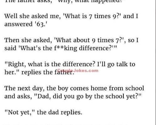 I’ve translated a popular Russian joke to English, wanna hear your reaction A young boy says to his father “Dad, our math teacher is asking to see you. “What happened?” The father asks. “Well, she asks me, ‘How much is 7 * 9?’ I answer ’63’ , then she asks, ‘And 9 * 7?’ so I asked ‘What’s the f*cking difference?’ “Indeed, what is the difference?” asks the father. ”Sure, I’ll go.” The next day, the boy comes home from school “Dad, have you gone by the school?” He asks.