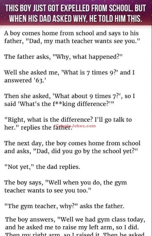 “Surprised, the father asks “Why did you get expelled? “Well, they summoned me to the principal’s office, and sitting there was the math teacher, the gym teacher, and the art teacher. “The f*ck was the art teacher doing there!?” asks the father. “That’s what I said” replied the boy.