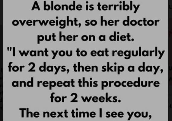 A blonde is terribly overweight, so her doctor put her on a diet. “I want you to eat regularly for 2 days, then skip a day, and repeat this procedure for 2 weeks. The next time I see you, you’ll have lost at least 5 pounds.”