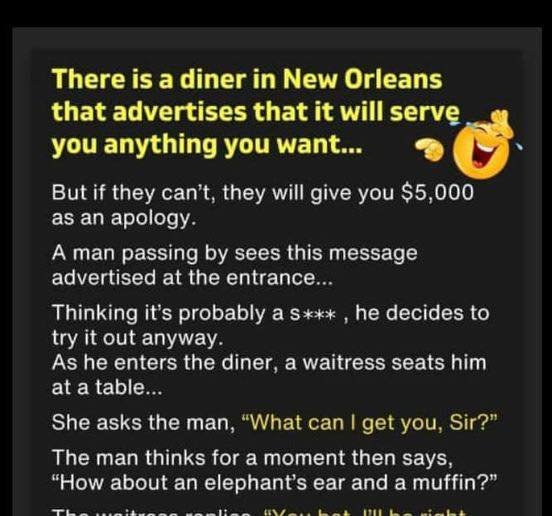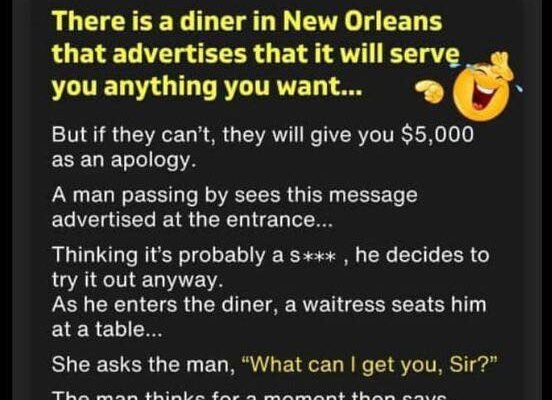 There is a diner in New Orleans that advertises that it will serve you anything you want…but if they can’t, they will give you $5,000 as an apology.