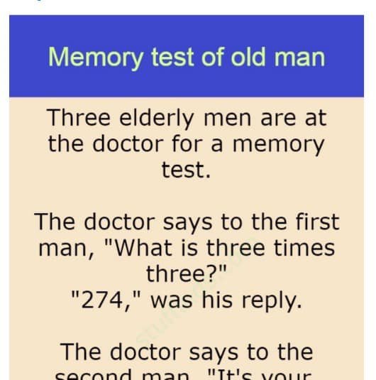 Memory test of old man Three elderly men are at the doctor for a memory test. The doctor says to the first man, “What is three times