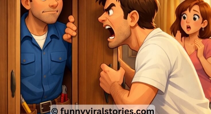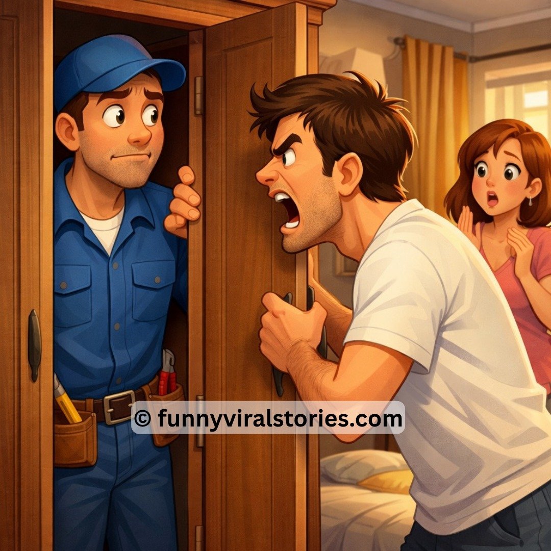 He rushes over opens the wardrobe door, sees the repairman, and shouts, “What the hell are you doing in there?”