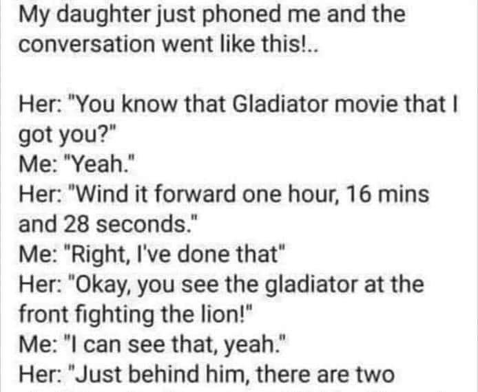My daughter just phoned me and the conversation went like this!.. Her: “You know that Gladiator movie that I got you?” Me: “Yeah. “Her: “Wind it forward one hour, 16 minutes, and 28 seconds. “Me: “Right, I’ve done that”, Her: “Okay, you see the gladiator at the front fighting the lion! “Me: “I can see that, yeah.”