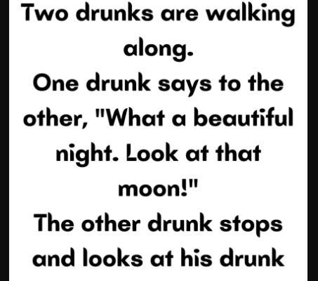 Two drunks are walking along. One drunk says to the other, “What a beautiful night. Look at that moon! ”The other drunk stops and looks at his drunk friend. “You are wrong. That’s not the moon; that’s the sun!”