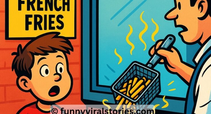 A boy read a restaurant sign that advertised fat-free French fries.