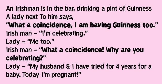 An Irishman is in the bar, drinking a pint of Guinness, A lady next To him says, “What a coincidence, I am having Guinness too. ”Irish man – “I’m celebrating. ”Lady – “Me too.”