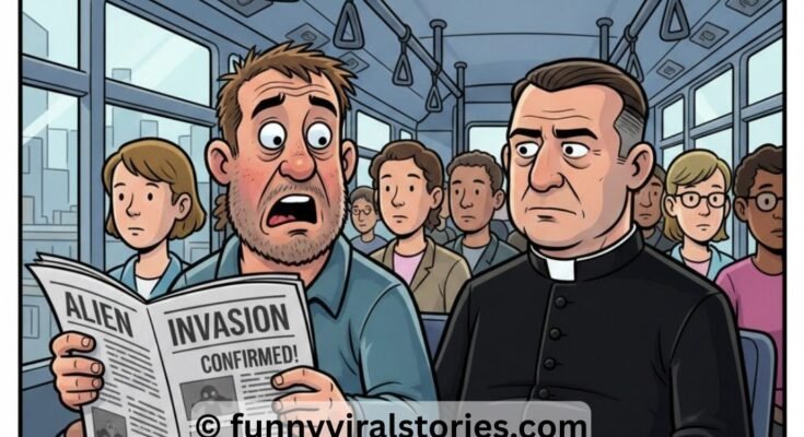 On a bus, a priest sat next to a drunk who was struggling to read a newspaper.