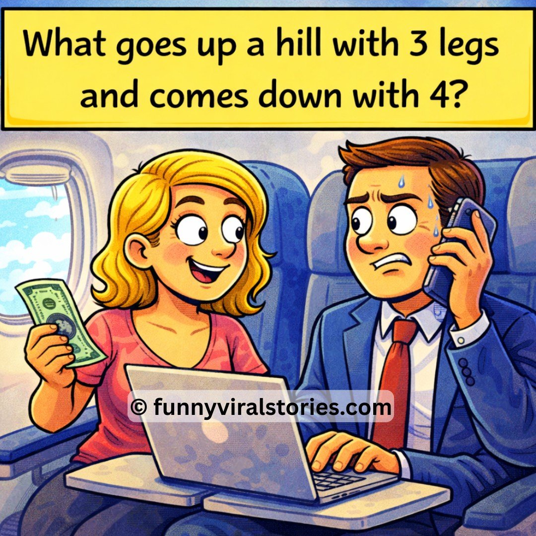 Then it’s her turn: “What goes up a hill with 3 legs and comes down with 4?”