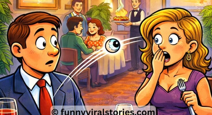 Embarrassed, she pops it back in place and says, “Oh my goodness, I’m so sorry to bother you. Let me make it up to you—may I buy you dinner?”