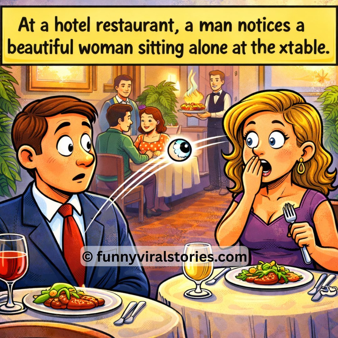 At a hotel restaurant, a man notices a beautiful woman sitting alone at the next table.