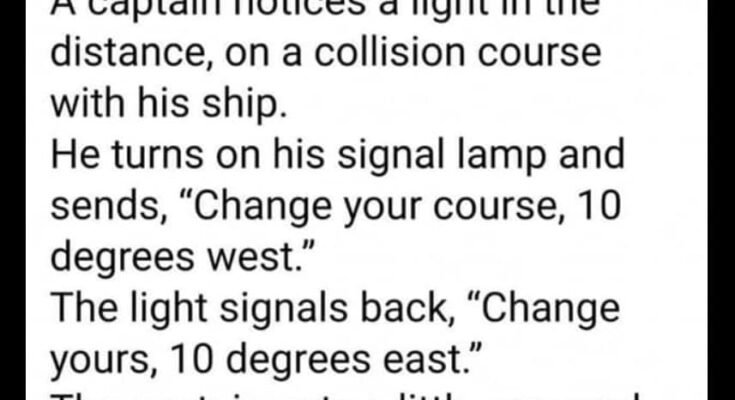 A captain notices a light in the distance, on a collision course with his ship. He turns on his signal lamp and sends, “Change your course, 10 degrees west. ”The light signals back, “Change yours, 10 degrees east.”