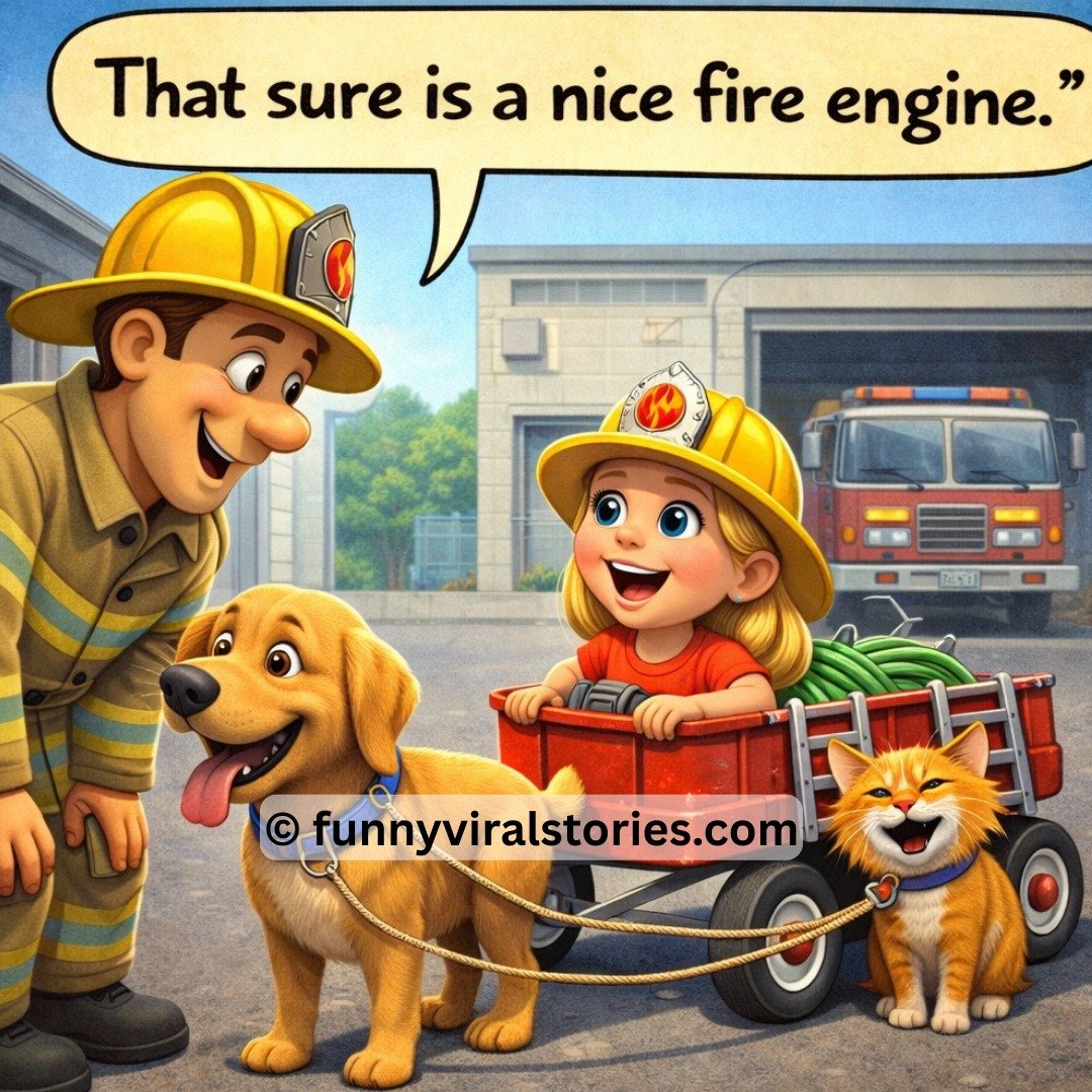 A fireman was working on the engine outside the station, when he noticed a little girl nearby in a little red wagon with little ladders hung off the sides and a garden hose tightly coiled in the middle. The girl was wearing a fireman’s helmet. The wagon was being pulled by her dog and her cat. The fireman walked over to take a closer look and said, “That sure is a nice fire engine.”