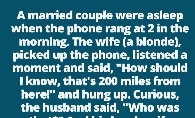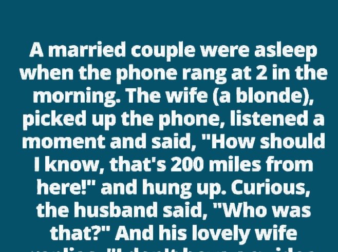 A married couple were asleep when the phone rang at 2 in the morning. The wife (a blonde), picked up the phone, listened a moment and said, “How should I know, that’s 200 miles from here!” and hung up.