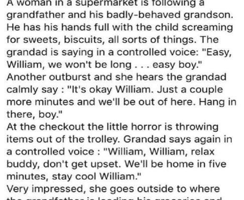 At the checkout the little horror is throwing items out of the trolley. Grandad says again in a controlled voice: “William, William, relax buddy, don’t get upset. We’ll be home in five minutes, stay cool William. “Very impressed, she goes outside to where the grandfather is loading his groceries and the boy into the car. She says: “It’s none of my business, but you were amazing in there.