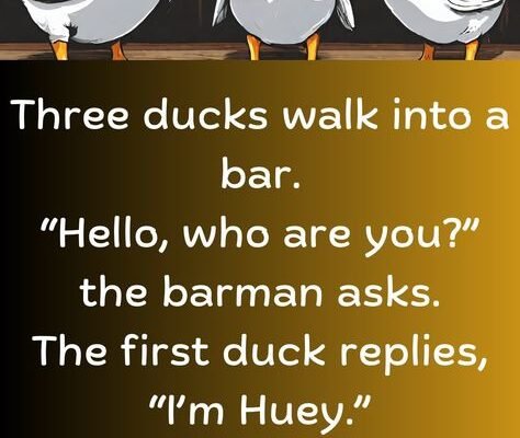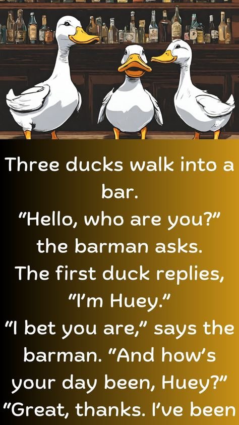 Three ducks walk into a bar.“ Hello, who are you?” the barman asks.