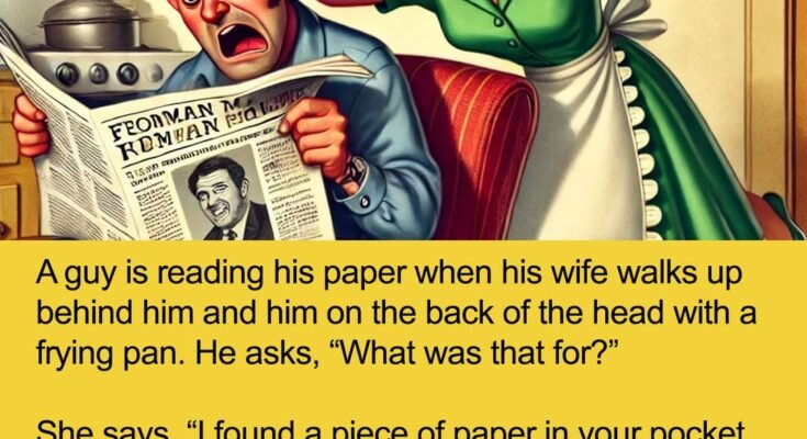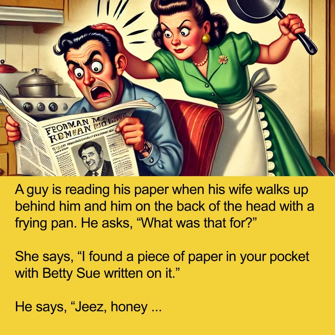 She shrugs and walks away. Three days later he is reading his paper when she walks up behind him and him on the back of the head again with the frying pan.