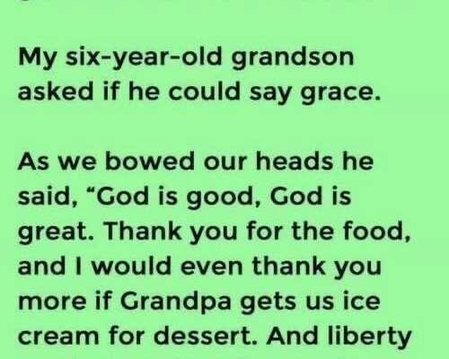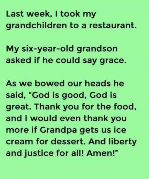 Last week, I took my grandchildren out to dinner, expecting nothing more than a quiet evening together. Before the food arrived, my six-year-old grandson looked up at me with a serious face and asked, “Grandpa, can I say grace?” I smiled and told him he could. The entire table bowed their heads as he folded his little hands and began to pray. “God is good, God is great. Thank you for the food… and I would thank you even more if Grandpa gets us ice cream for dessert. And liberty and justice for all. Amen.” For a second, the restaurant was completely silent.