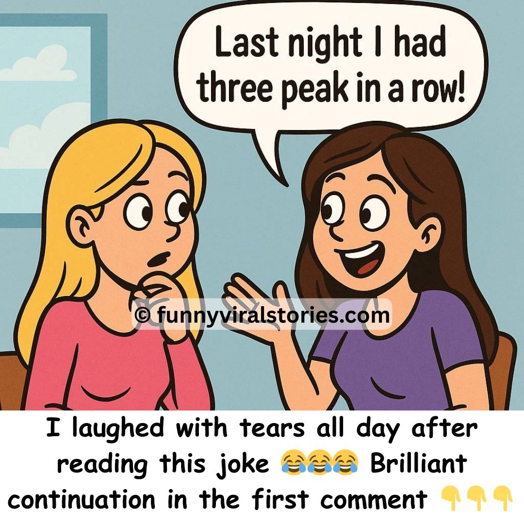 A Blonde And A Brunette Were Discussing April 7, 2026 - by Admin - Leave a Comment A blonde and a brunette were discussing their boyfriends. Brunette: “Last night I had three peak in a row!” Blonde: “That’s nothing; last night I had over a hundred.” Brunette: “My god! I had no idea he was that good.” Blonde: (looking shocked) “Oh, you mean with one guy?”