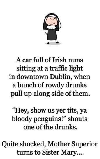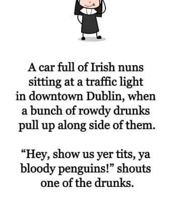 A car full of Irish nuns sitting at a traffic light in downtown Dublin, when a bunch of rowdy drunks pull up along side of them. “Hey, show us yer tits, ya bloody penguins!” shouts one of the drunks.