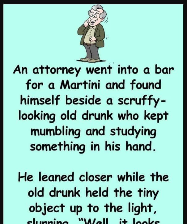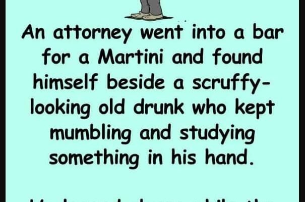 An attorney went into a bar for a Martini and found himself beside a scruffy-looking old drunk who kept mumbling and studying something in his hand.