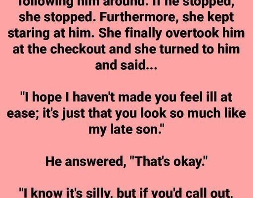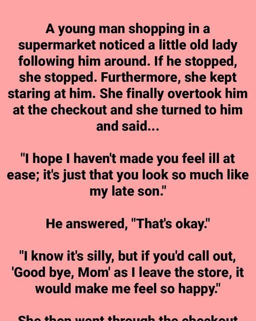 While walking through the grocery store, a young man began to notice something odd—an elderly woman seemed to be quietly following him. She wasn’t being obvious, but every time he stopped, so did she. When he reached for an item, she mimicked the motion, though not the product. She never came too close, yet she remained within sight, always observing him. At first, he brushed it off as coincidence. But by the time they reached the checkout, she slowly approached him and offered a gentle explanation: “I hope I didn’t make you uncomfortable. It’s just… you look so much like my late son.” The young man,