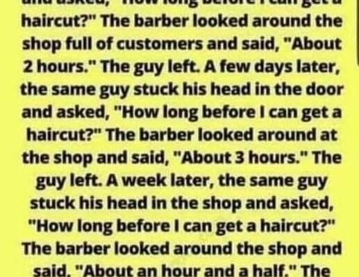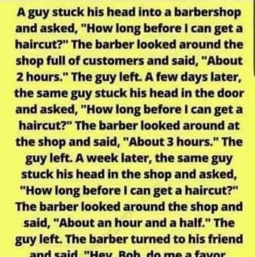 The barber looked around the shop and said, “About an hour and a half.” The guy left. The barber turned to his friend and said, “Hey, Bob, do me a favor, guy left.