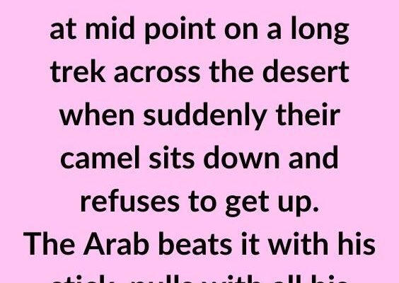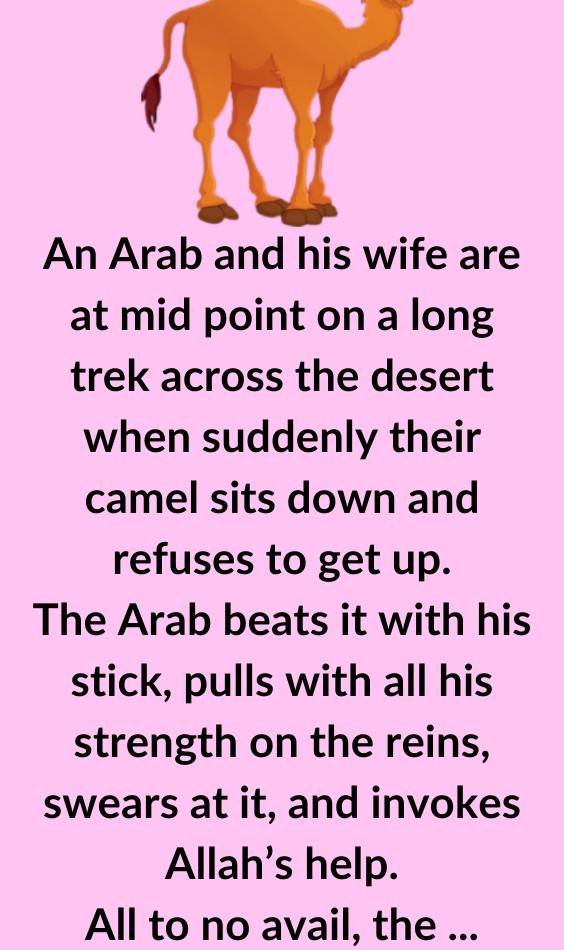 An Arab and his wife are at mid point on a long trek across the desert when suddenly their camel sits down and refuses to get up.